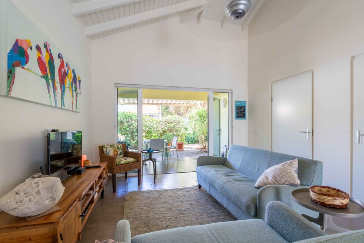 Het sfeervol ingerichte appartement heeft een woonkamer met airco, zithoek, eethoek en een smart TV. Via de openslaande deuren bereikt u de overdekte porch met een zitje.