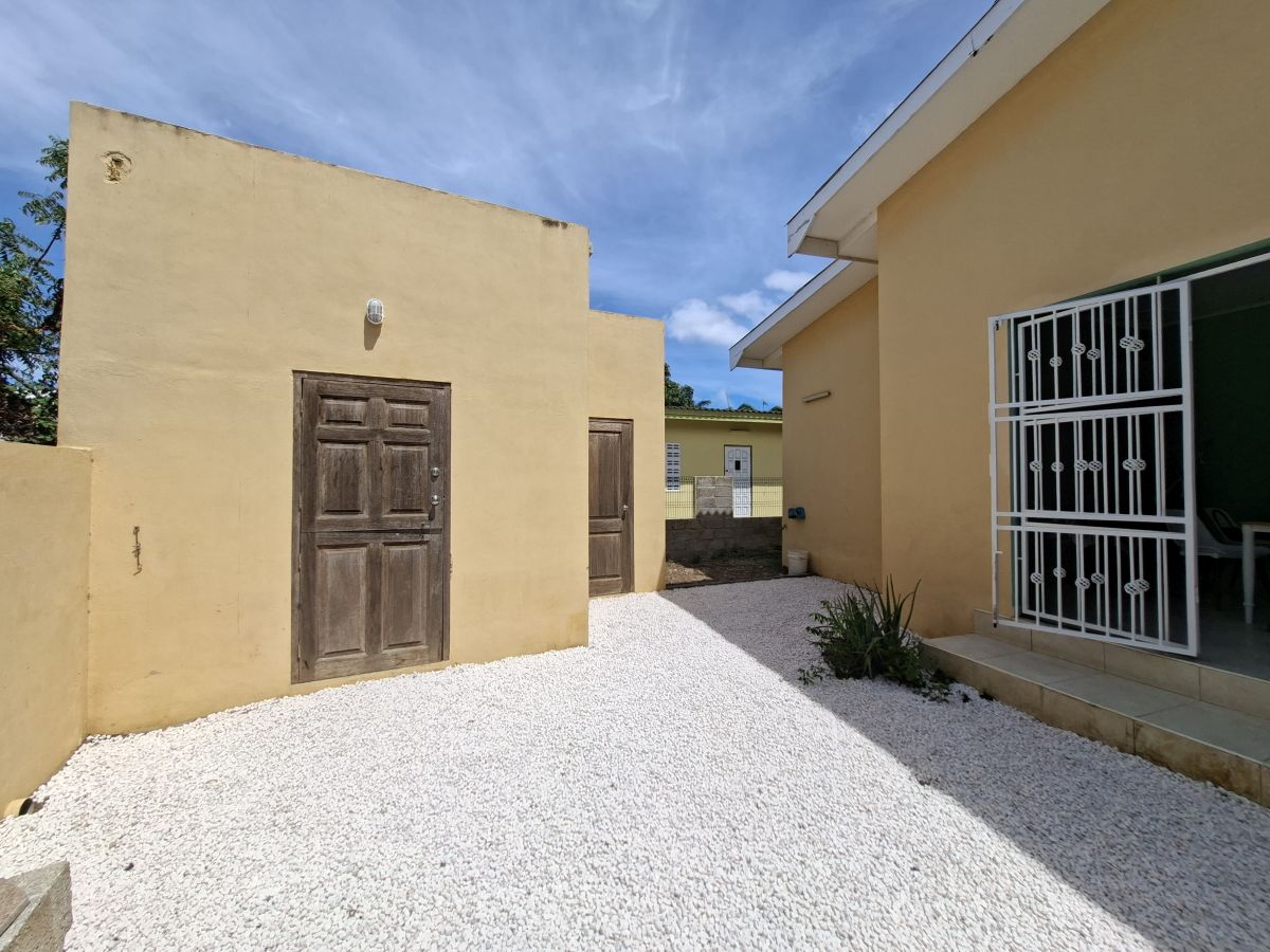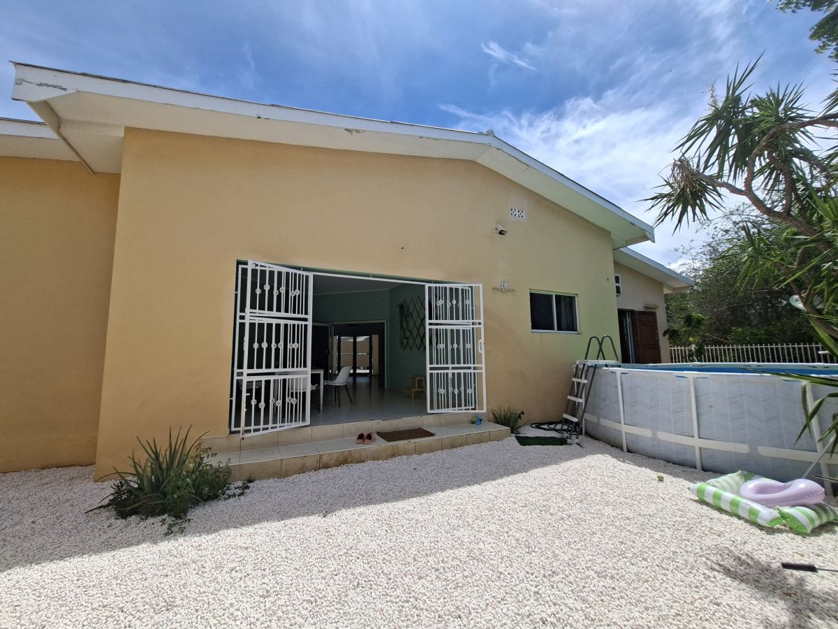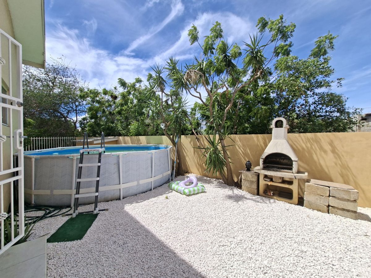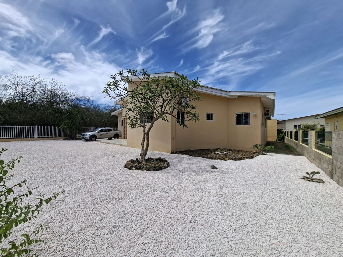 De woning bevindt zich op een volledig omheind terrein met een elektrische poort en biedt parkeergelegenheid voor twee auto’s op eigen terrein. Dankzij de gunstige ligging op de wind is het hier aangenaam wonen. De tuin is onderhoudsvriendelijk aangelegd met witte steentjes en tropische beplanting en beschikt over zowel een overdekte voorporch als een afgesloten overdekte porch aan de achterzijde. In de achtertuin staat een opzetzwembad, waarvan het onderhoud voor rekening van de huurder is. Daarnaast zijn er twee separate bergingen aanwezig voor extra opslagruimte.